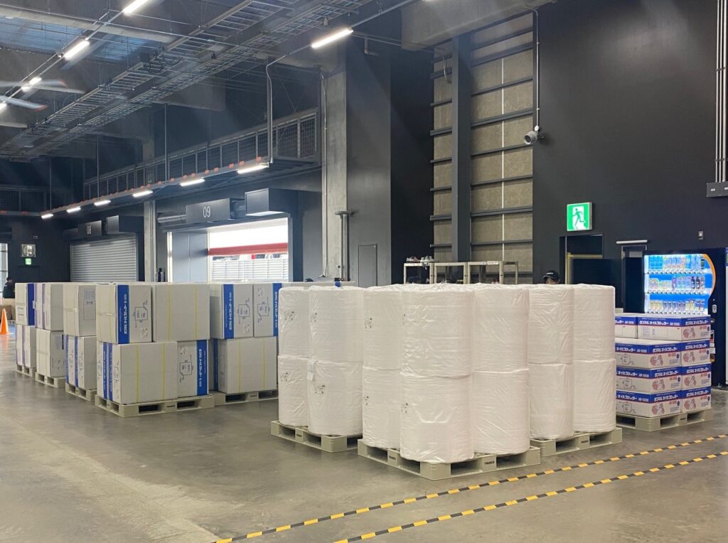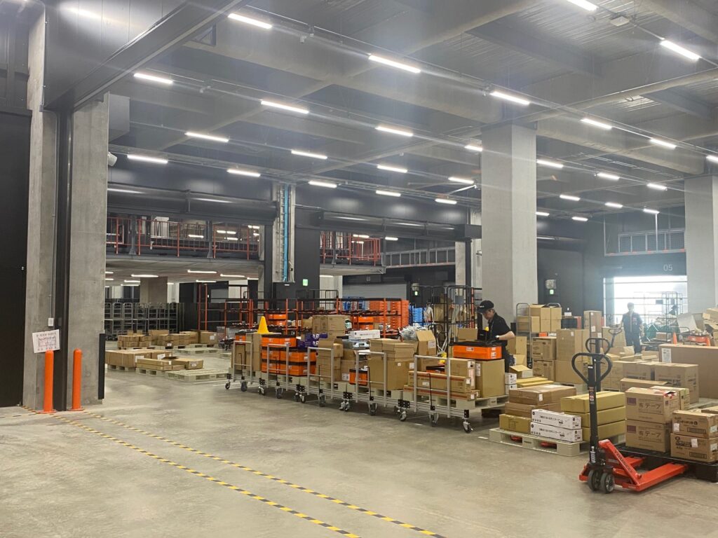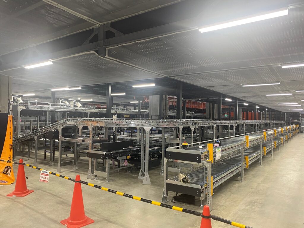 機械によって搬出された商品が建物西端で納品先ごとに荷合せされ、お客様の元へ配達